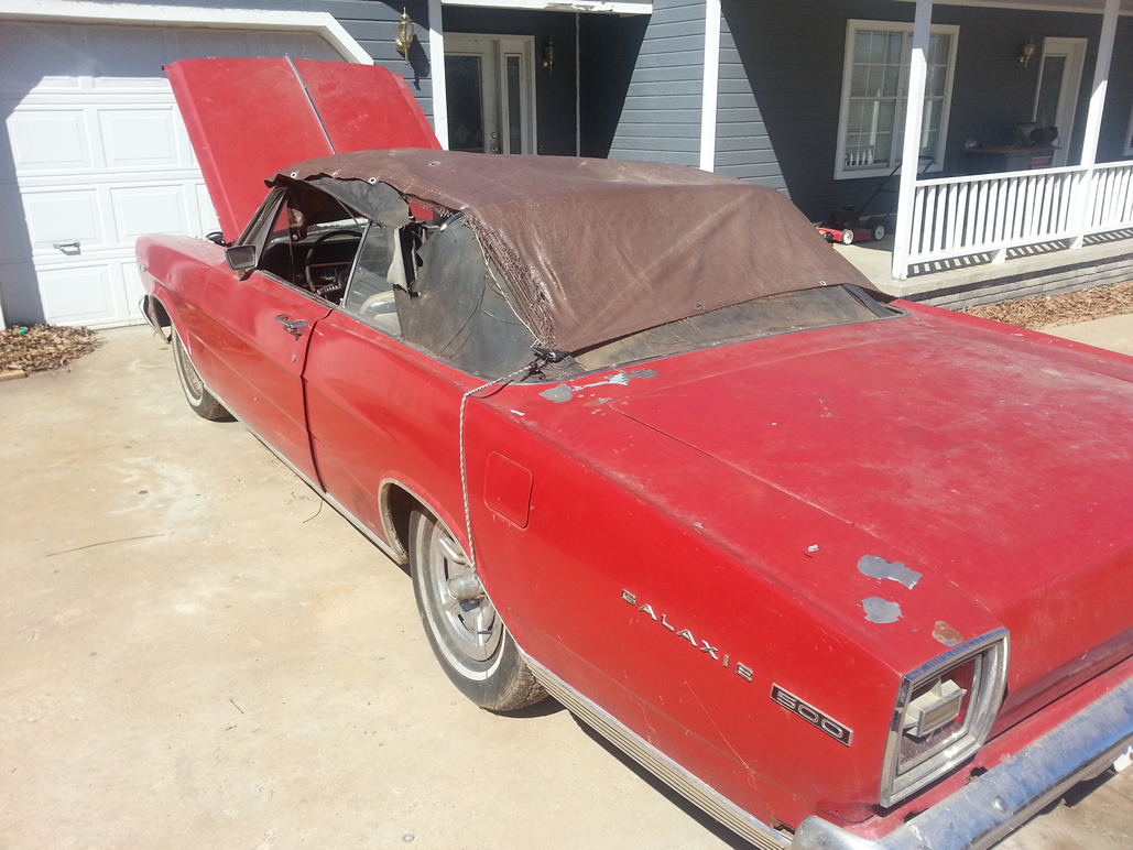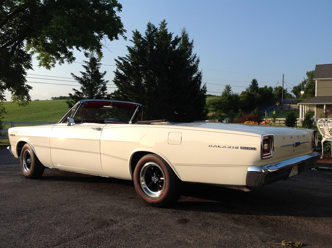 C6 automatic transmission. power steering. power disc brakes. hooker headers. 4-barrel carburetor. chromed valve covers. air cleaner and master cylinder cover. The engine and the underside and chassis are very clean. well painted and detailed. Also has custom dual exhaust. Added factory options are a brake light on the dashboard and AM/FM Radio. The black vinyl power top and vinyl top boot with glass rear window are in very good condition. The interior is black vinyl with front bucket seats. It has a power driver's seat and also has power windows. The Galaxie has Magnum 500 chromed style wheels and hubcaps with Hercules P235/60R15 front and P255/60R15 rear black-wall tires. The trunk area is immaculate with a new spare. This is a one-family owned vehicle in very good condition. The current owner received it from his Aunt and Uncle. It has always been well loved and well maintained. |