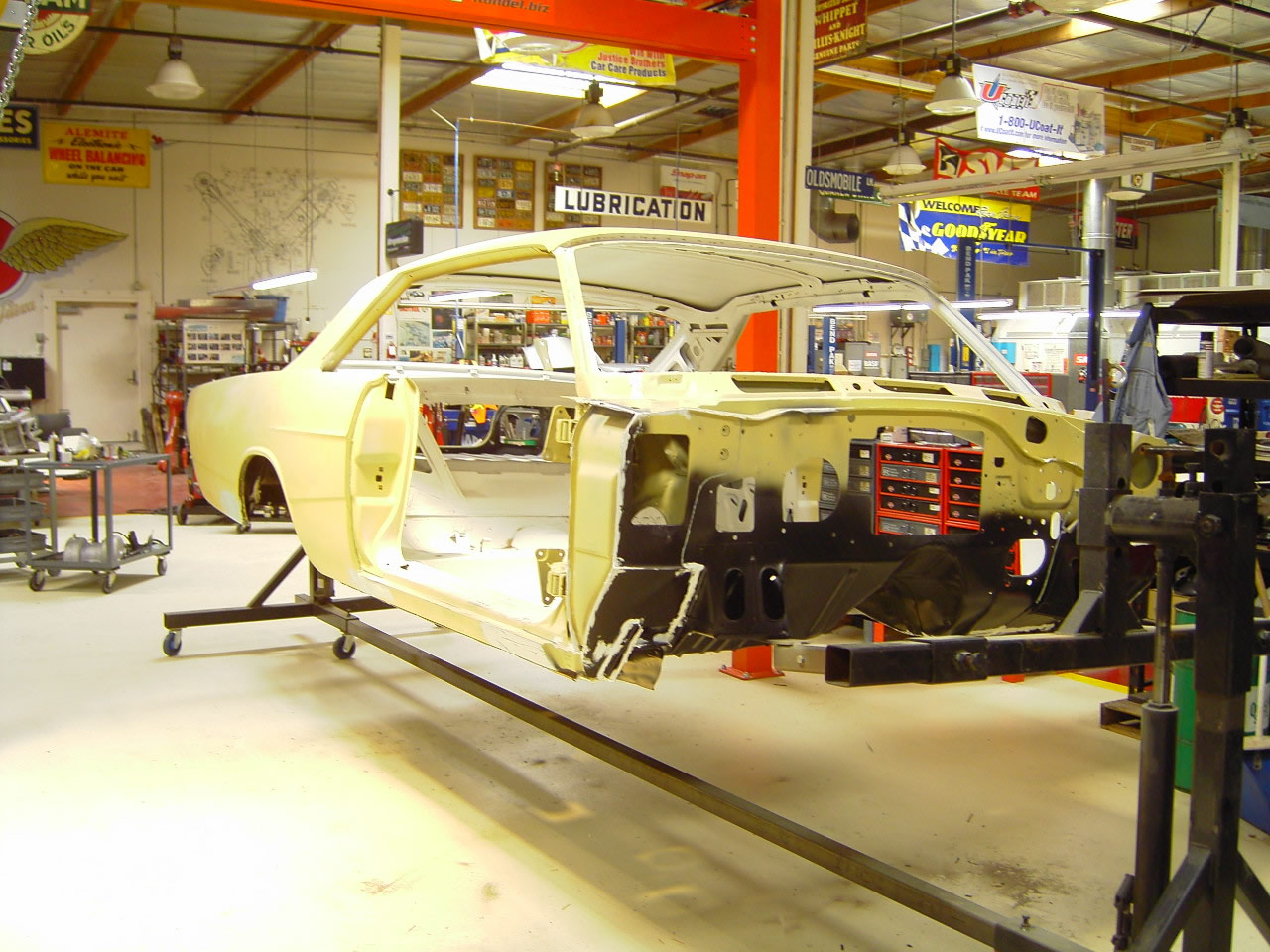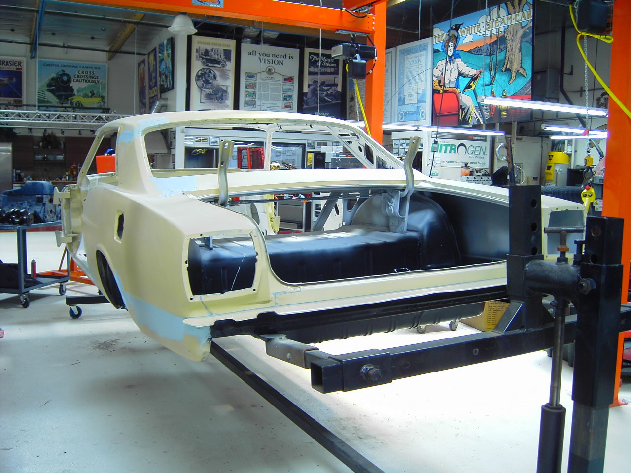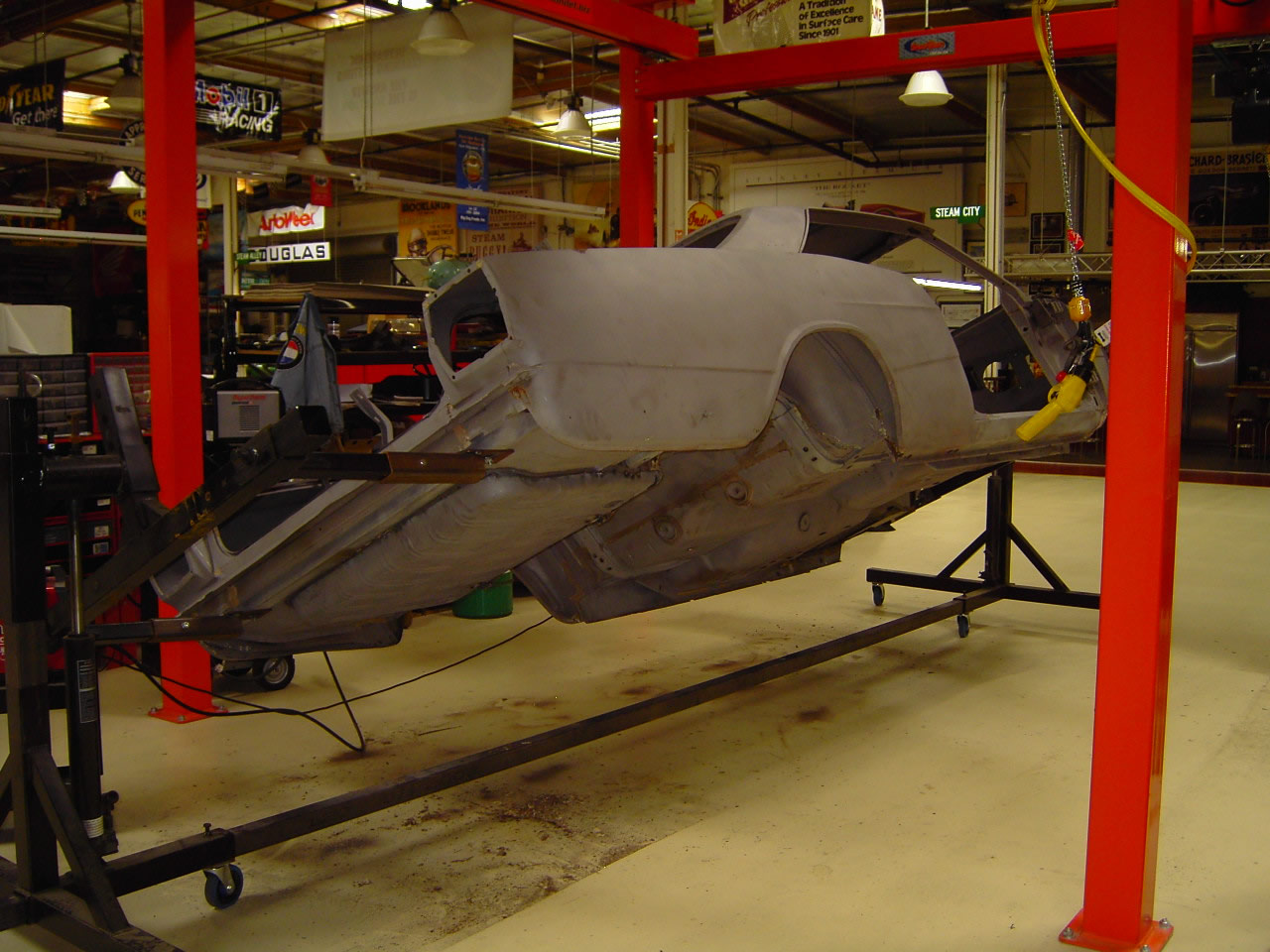 alterations to the cowl were made to fix the issue with the damage from a previous accident. Also the repairs to the Left rear quarter were made. Stress cracks to the rear quarters are common to the 7-Litre Hardtops, due to the substantial amount of torque from the 428 ci engine. A stock 7-Litre engine puts out an impressive 462 foot pounds of torque. In addition to the rust repairs, all body panels will be gone over and straightened. Once all repairs were made the body was Epoxy |