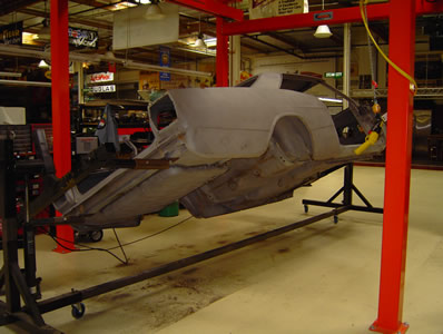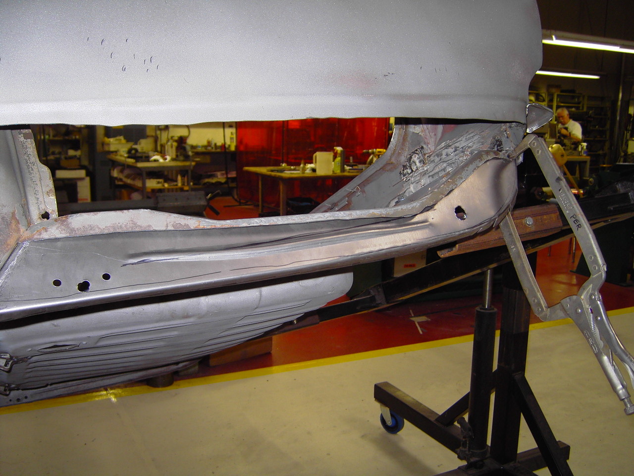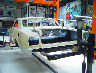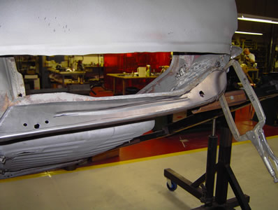 primed to seal the metal. The next step will be to go over the entire body to make sure there are no body imperfections like small dents and scratches. During the restoration, Jay's full time body man, Per, left for a month vacation so progress came to a halt. Even with a month "delay", the progress has been amazing. In the begining of August, Per was back to work and things moved along quickly. Some variations are being made to the car, but all are in keeping with the spirit of the manual shift 7-Litre. Jay has opted for a custom built Roush FE engine, with fuel injection that will produce 590hp. The stock 4 speed will be |
