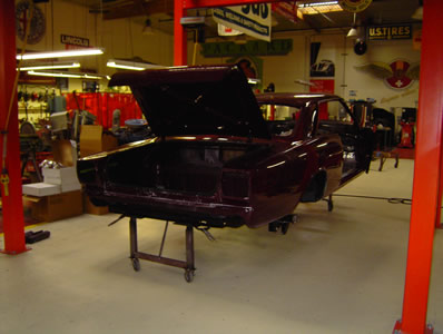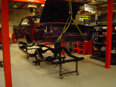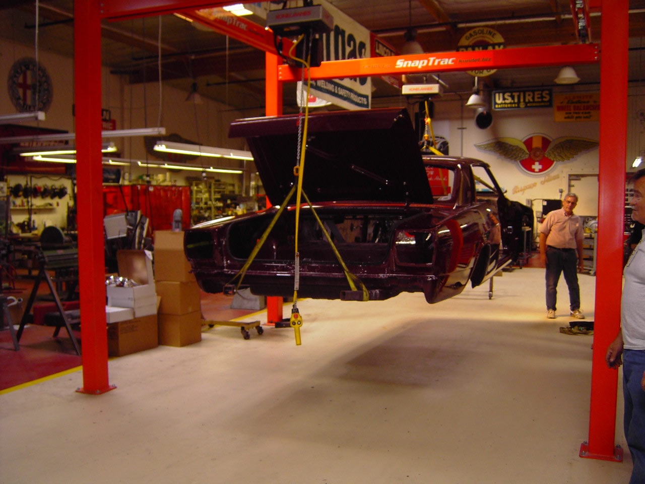of the swirls marks. Once all painted parts of the car were finished, it was time to get the body back on the frame. Because Jay opted for the custom Roush 511, the suspension and frame got some upgrades to handle the substantial increase in Horsepower and Torque. Jay's recent acquisition of a Snaptrac, made the process of reuniting the The finished frame is rolled under the suspended body.