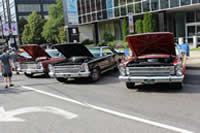 The "Cruisin' Downtown, Manchester NH" show is a HUGE event that attracts many of our New England friends, in the fall. This year, Vivian Hartlett of Lost Legends Restorations, was looking to assemble a bunch of the cars she has restored, at the event to showcase her work. This includes at least 3 7-Litres, owned by Charlie Trudel, Ted Mottor and Ron Viterelli. Unfortunately, Ron was not able to attend. But, as luck would have it, the 7-Litre website had just been contacted a week before, by a new member who happens to live nearby. His name is Bob Capozzi and he owns a nicely restored, and very rare Emberglo and Parchment, 4 speed convertible....exactly like the one Ron Viteralli was going to bring! Vince had been up to New England the week before with his family, and hooked up with the Trudel family in Boston. Charlie suggested Vince come up, to see the show, hang with the 7-Litreites and finally get to meet Vivian, the 7-Litre restorer, extraordinaire. The rest, as they say, is history.
